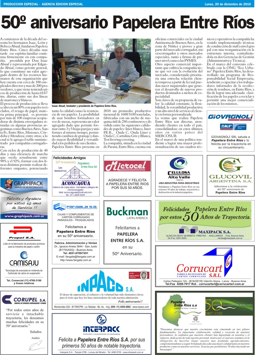 Dic 2010Con motivo del 50 aniversario de la empresa, el diario Clarín ha publicado una nota alusiva a la trayectoria de la empresa.